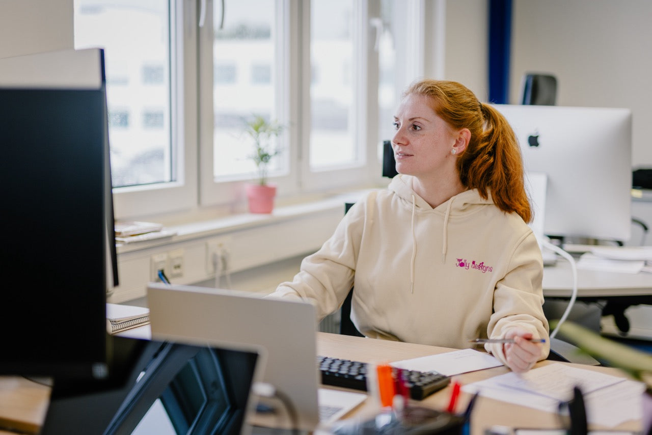 est notre fée du camp super organisée. La maman de deux enfants presque adultes s'occupe des livraisons, garde une vue d'ensemble de l'entrepôt et imprime les nombreux bons de livraison pour vos paquets. Chaque jour, elle emballe avec beaucoup d'amour nos beaux produits Jolly Designs et les prépare pour l'expédition. Iris vous aide également à personnaliser vos produits.