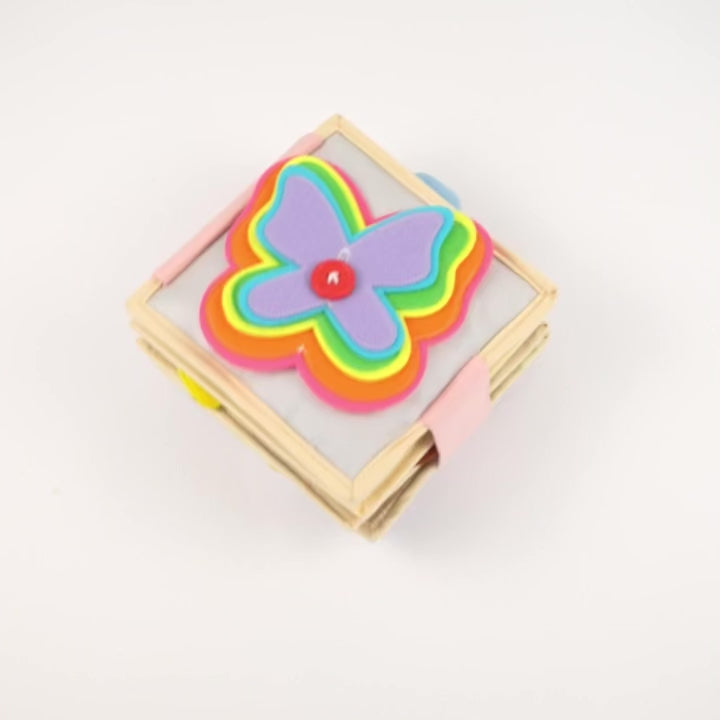 Un papillon coloré se pose délicatement sur les pages de ce livre textile unique et ouvre la porte d’un petit monde merveilleux. Dans le Mini Quiet Book Papillon Enchanté, les enfants peuvent déboutonner des ailes, découvrir des formes et même cacher une photo personnelle dans une coquille. Un miroir les invite à rencontrer leur propre reflet – un moment ludique qui renforce la perception de soi.