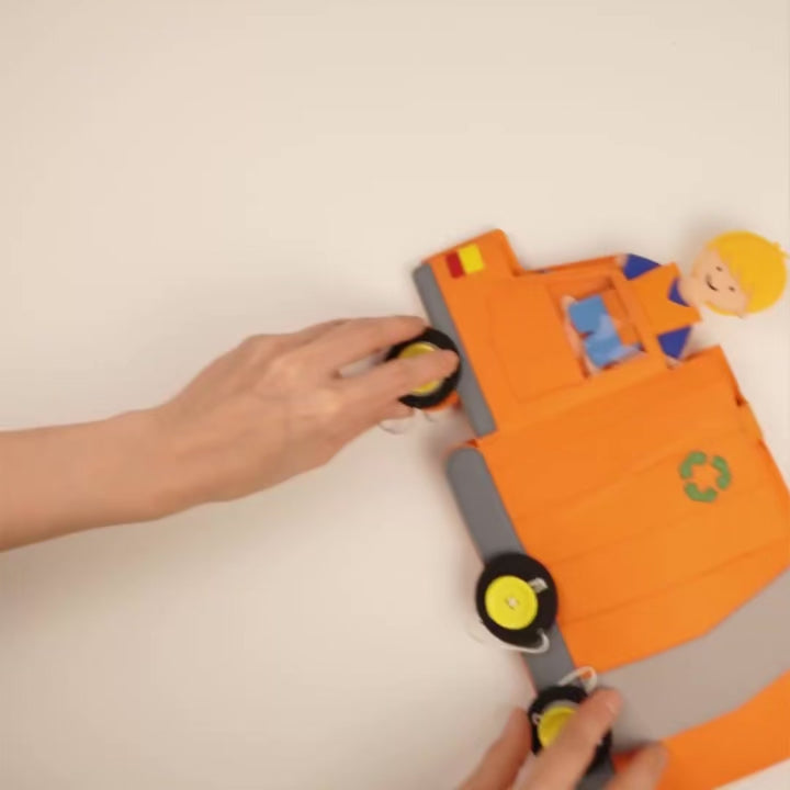 Ein besonderes Highlight ist die Sensoriktasche auf der Rückseite: Hier heißt es Suchen, Fühlen und Entdecken – eine spielerische Übung für Konzentration, Geduld und Feinmotorik. Durch das Müllauto werden nicht nur motorische Fähigkeiten trainiert, sondern auch Werte wie Respekt und Achtsamkeit gegenüber der Umwelt vermittelt.