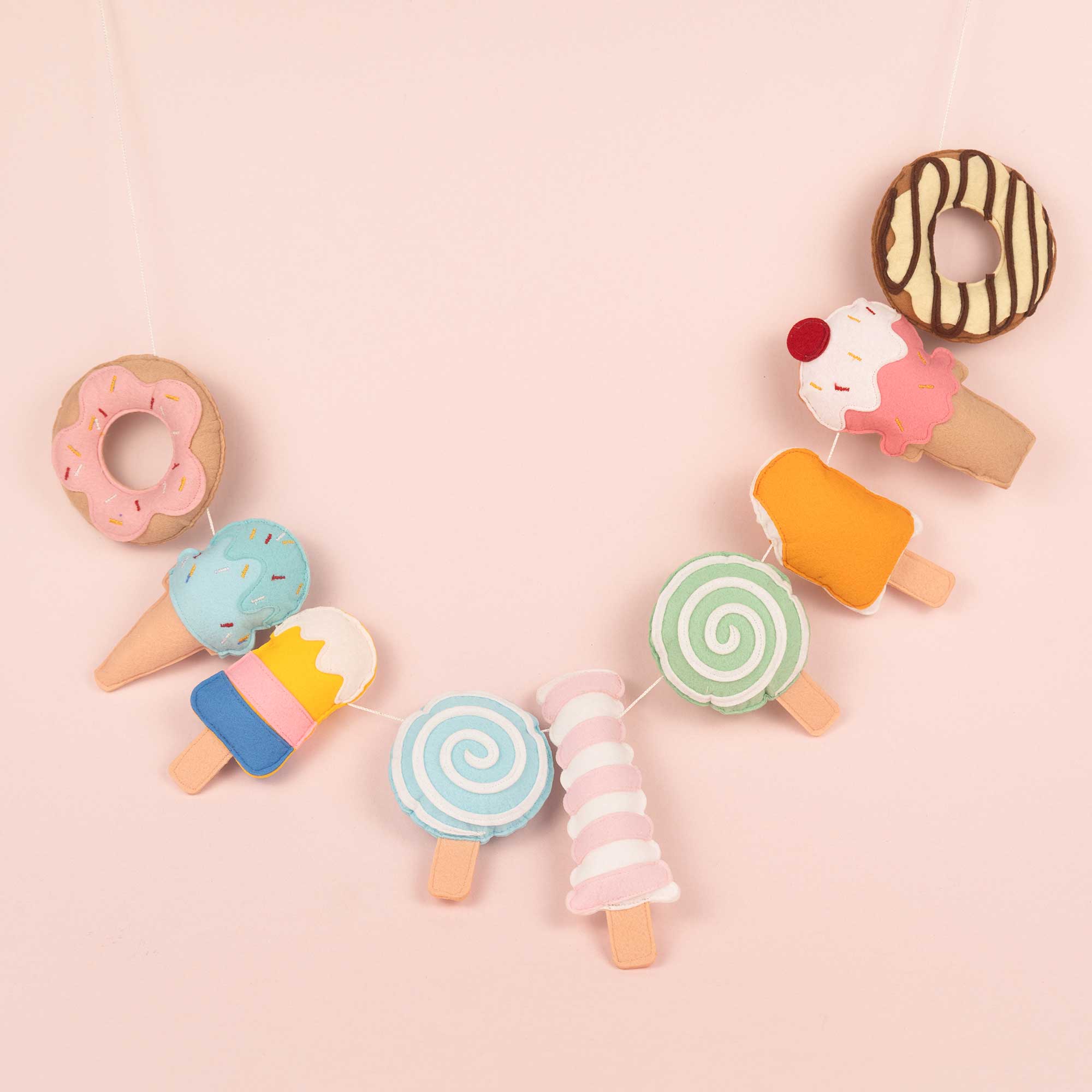 Die Wimpelkette Zuckerstückchen bringt verspielte Leichtigkeit und sanfte Pastellfarben ins Kinderzimmer. Liebevoll handgefertigte Filzfiguren in Form von Eiscreme, Donuts und süßen Leckereien sorgen für fröhliche Akzente und eine warme, einladende Atmosphäre.